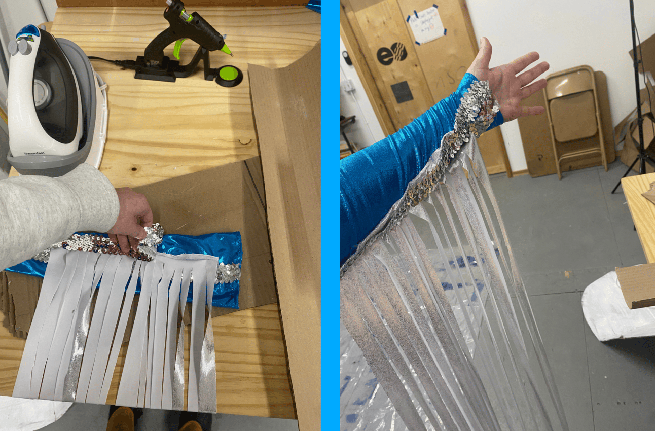I also made some dramatic sleeves by modifying this leg warmer tutorial for my arms and excluding the cuffs. I horrendously sewed a big piece of silver metallic fabric to the sleeves and tried to cut equal sized strips to make it look like the sleeves had crazy long tassels. Then I glued more sequin strips over the ugly stitching.